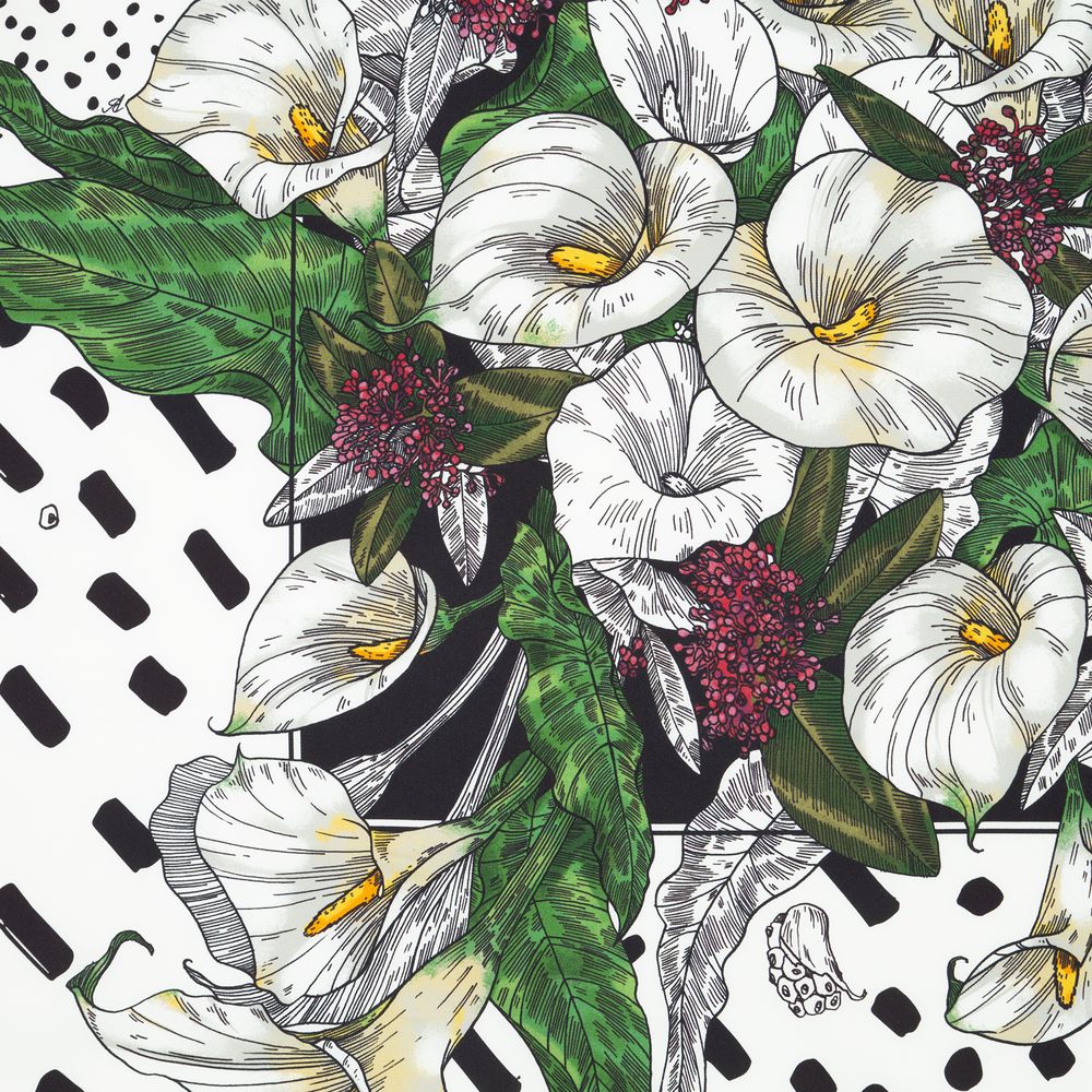 Шелковый платок с цветочным принтом открывает простор фантазии — его можно использовать как шарф, головной убор или декоративный элемент для верхней одежды и аксессуаров.